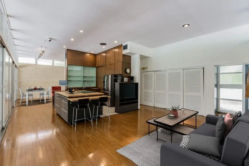 Did you notice catch the mention of a pool? It offers a striking sweep of curved corners and blue shimmering water in contrast with the right angles and clean straight lines of the home’s design. An ample expanse of pool deck could be the scene of Gatsbyesque parties where the main conversation draw could be the house itself! Even the steps leading to the back patio create a touch of drama and also signal another tipoff to the mid-century design: lavish use of organic materials, including block, brick, stucco and wood.